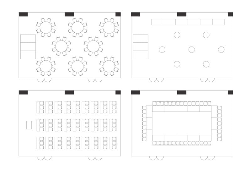 | 会場名 | 場所(階) | 面積(㎡) | 天井高(m) | シアター(名) | スクール(名) | ロの字(人) | 立食(人) | 正餐 / 卓盛(人) | ||||||