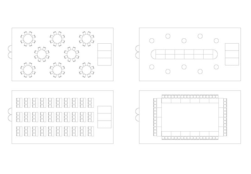 | 会場名 | 場所(階) | 面積(㎡) | 天井高(m) | シアター(名) | スクール(名) | ロの字(人) | 立食(人) | 正餐 / 卓盛(人) | ||||||