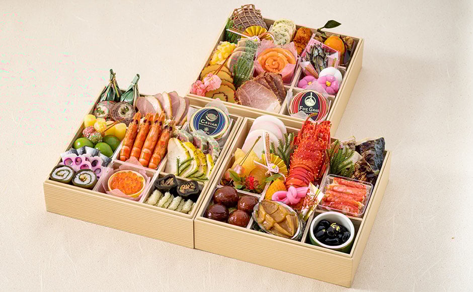 十勝ローストビーフ、真鱈子旨煮、蟹とほうれん草の信田巻、メープルくるみ、完熟金柑、ほうれん草と若鶏のテリーヌ、海老サラダ、スモークサーモン、田作り、紅白花餅、伊達巻、黒糖ローストポーク、中華くらげ、フォアグラ、雪見紅梅