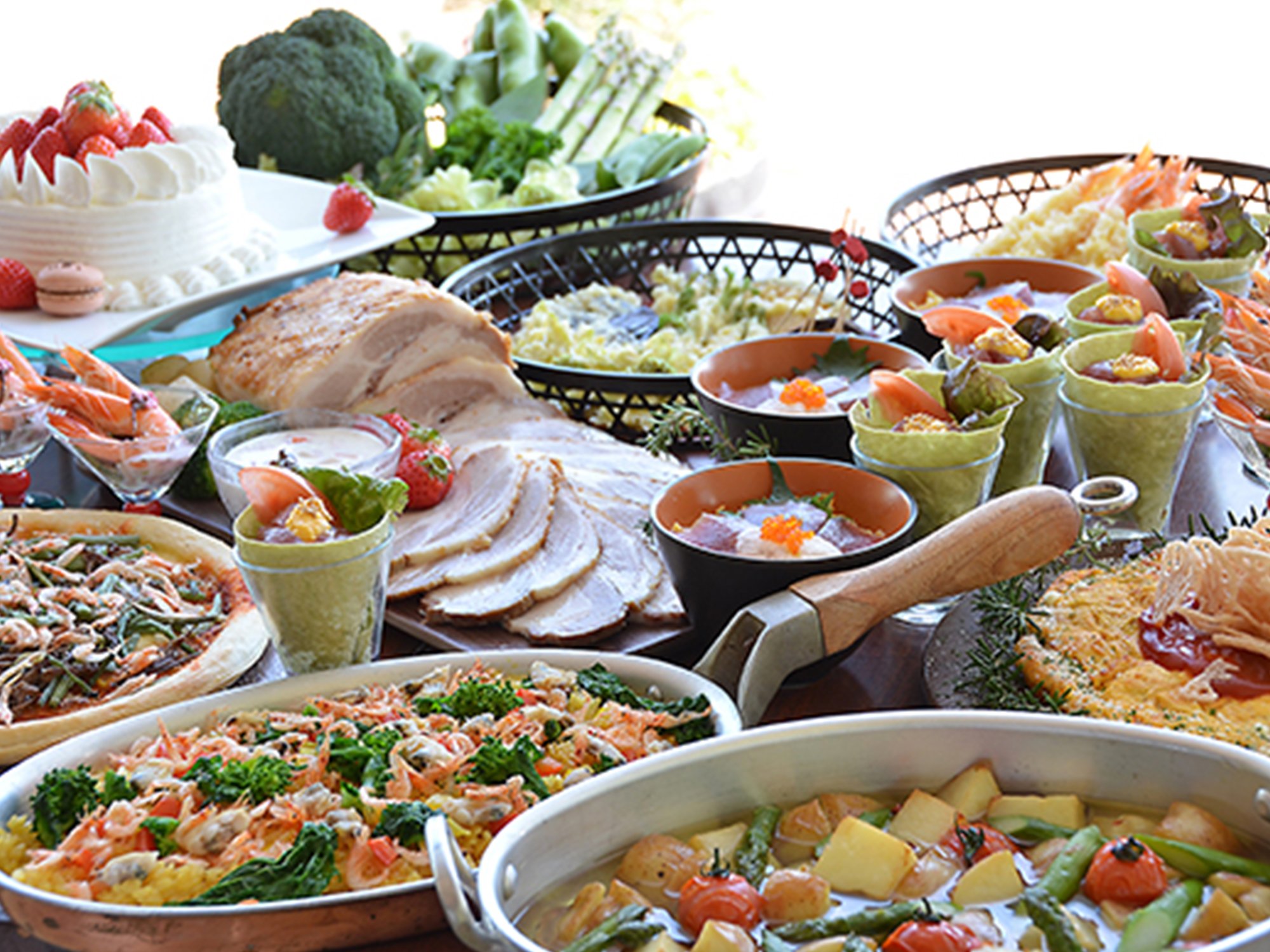 クラムチャウダー、春キャベツのフラン、新じゃがとアスパラのアヒージョ、白身魚と浅利のアクアパッツア、マグロの大葉竜田揚げ/フライドチキン、ローストポーク 苺ソース、若鶏と春野菜の照り焼き、春キャベツの回鍋肉、浅利と菜の花のピラフ サフラン風味、春野菜の鶏腿肉のグリーンカレー